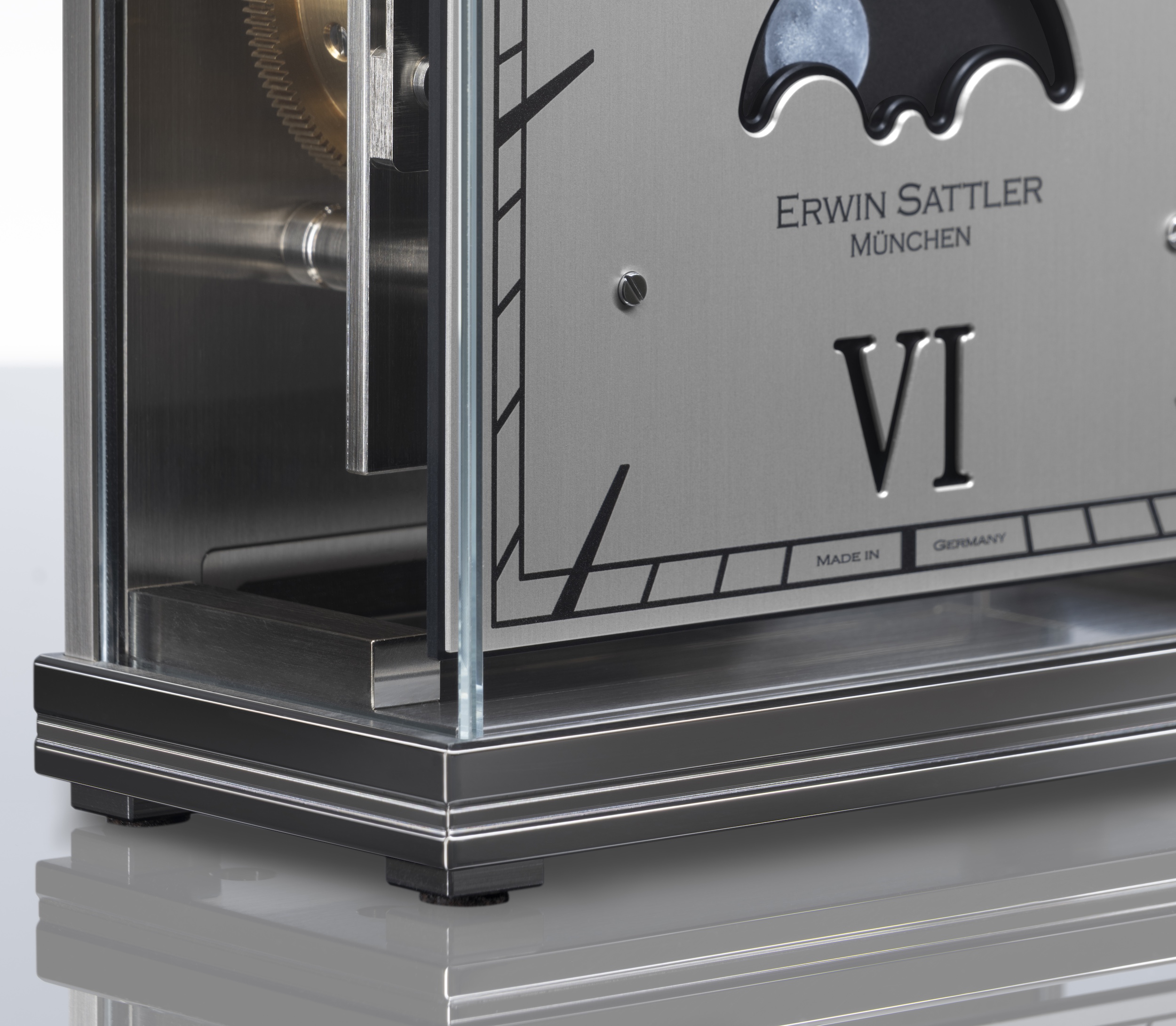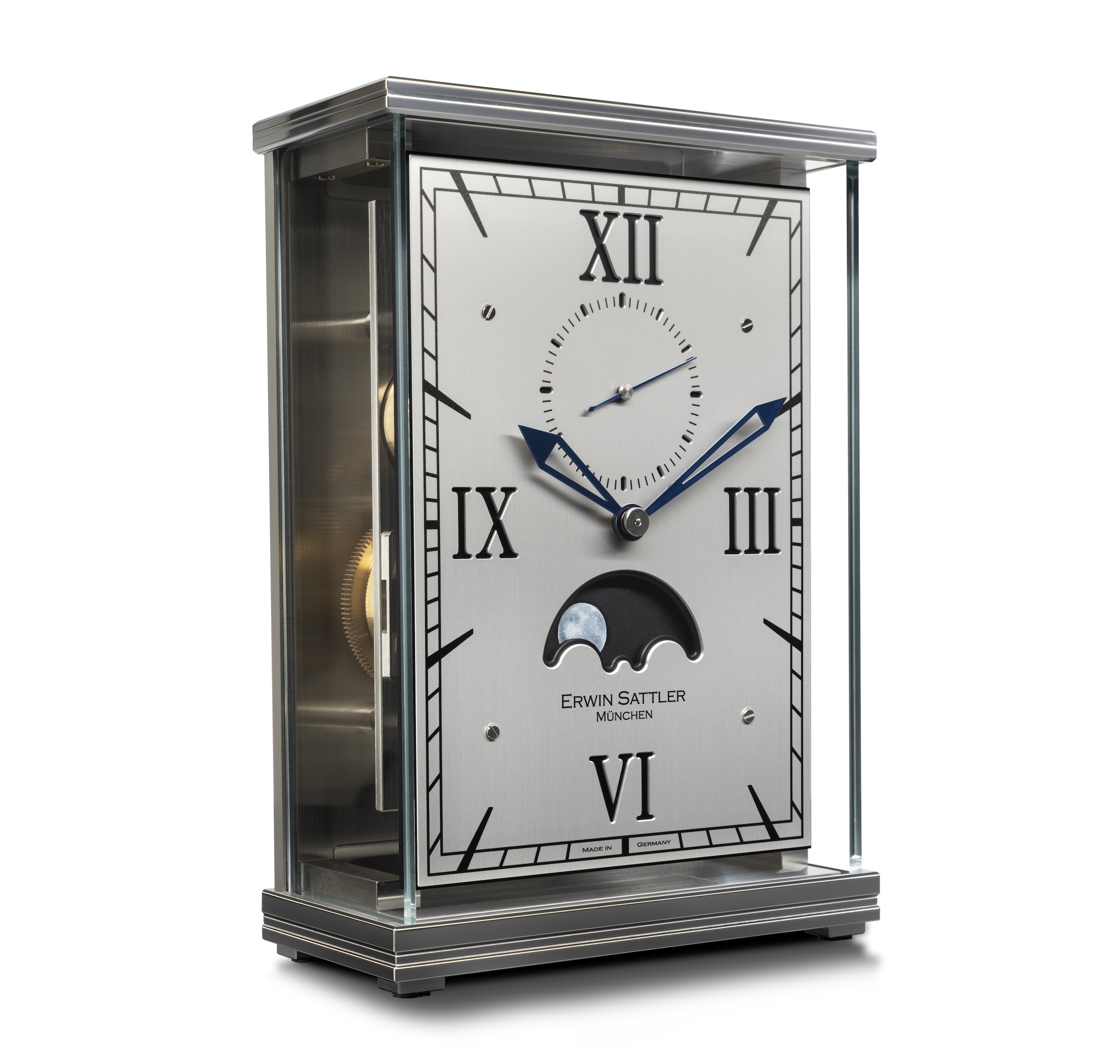 The new Lunaris II builds on the high-quality design and precise technology of its predecessor and consistently takes it a step further. Here, too, the frameless glass case characterizes the extraordinary appearance of the timepiece. However, the lid and base have been newly designed: they are now crafted from finely brushed stainless steel, enhanced by a precisely milled and polished decorative groove that adds a subtle but effective design highlight. These new elements lend the clock a modern elegance without altering its characteristic look.
