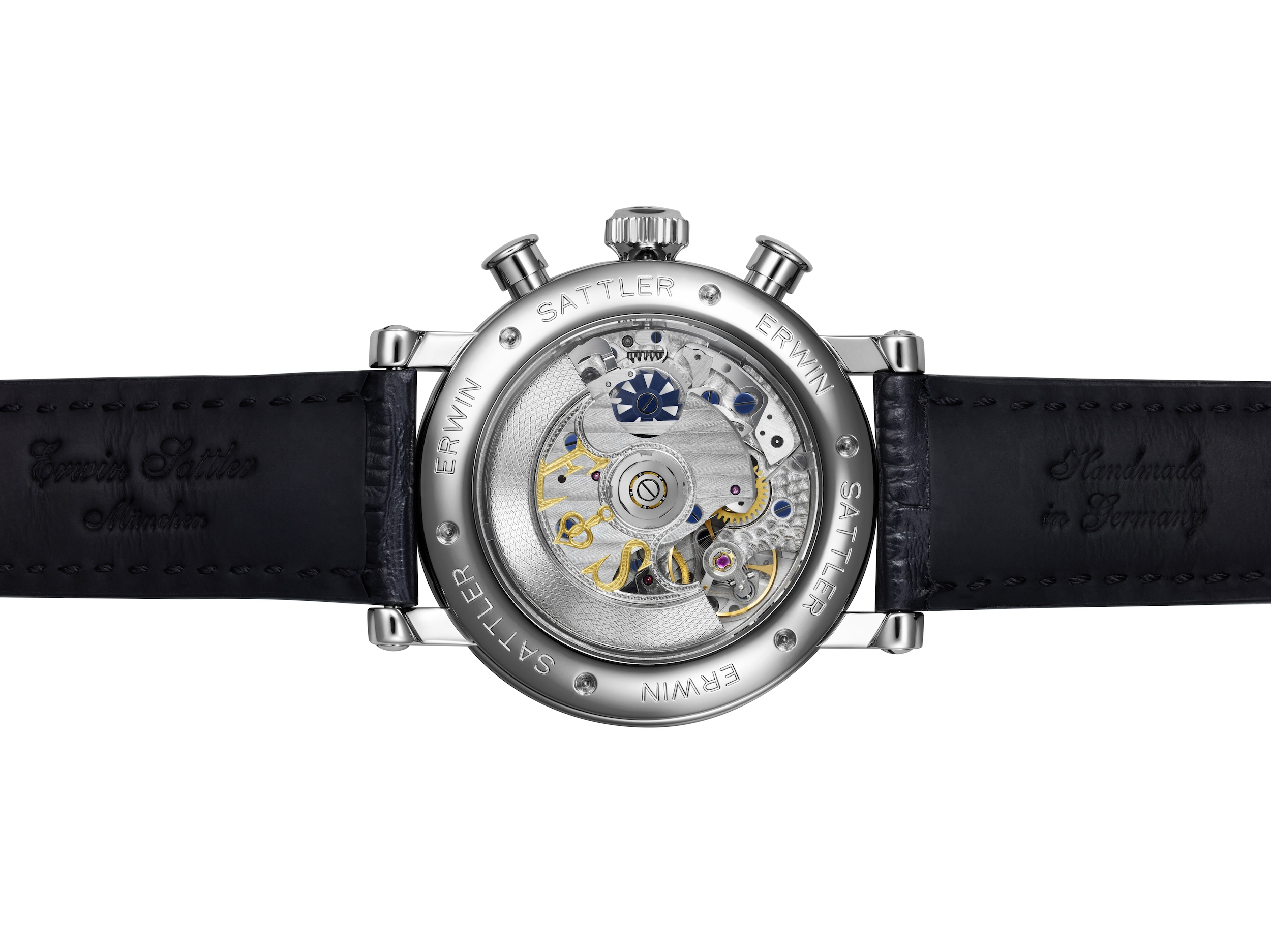 Von Hand graviert, guillochiert und skelettiert präsentiert sich der edle Rotor, er ist zudem mit beliebigen Initialen individualisierbar und wird so zu einem speziell für seinen Besitzer gefertigtem Unikat. Ein komplett hochglanzpoliertes und verschraubtes Edelstahlgehäuse, ein handgenähtes Vollumbug-Lederband und die Krone in Form einer Präzisionspendeluhr-Werkmutter mit ausgefrästem Logo, stehen für die Liebe zum Detail, die in der Firmenphilosophie der Manufaktur Erwin Sattler fest verankert ist.