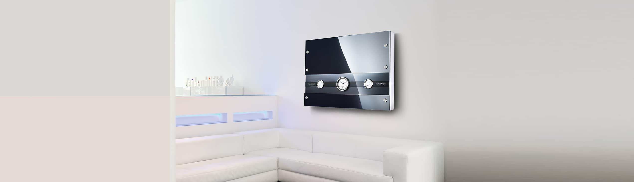 Gehäuse | Höhe: 88,5 cm (mit ausgefahrener Scheibe 127 cm), Breite: 120 cm, Tiefe: 20 cm Edelstahl, Panel nach Wunsch, LED Beleuchtung. Im Panel eingesetzt: Schiffsuhr Navis Quarz, Thermometer, Barometer Hinter der unteren Klappe, Standardausstattung: 2 Einlagen für jeweils 4 Handaufzugsuhren |