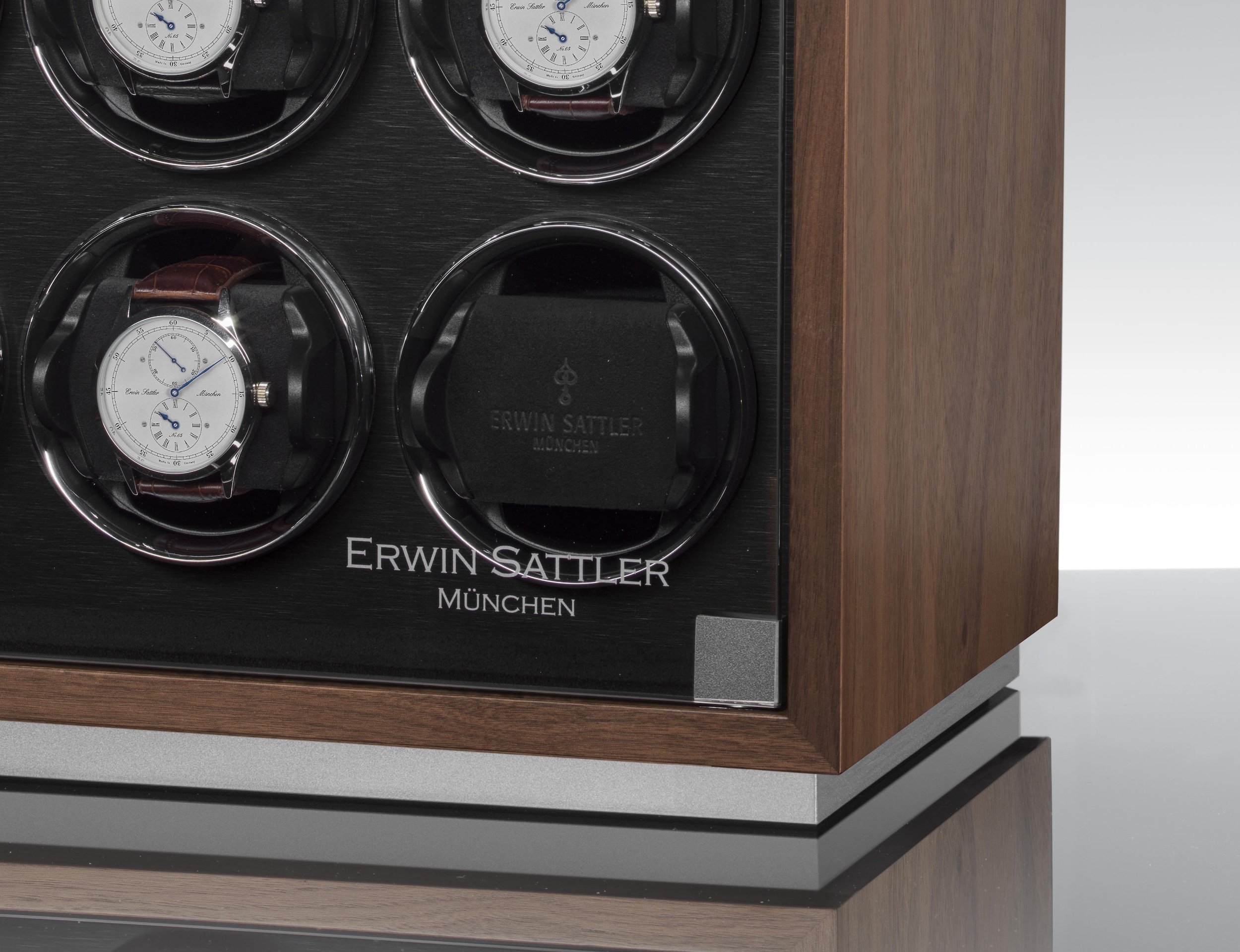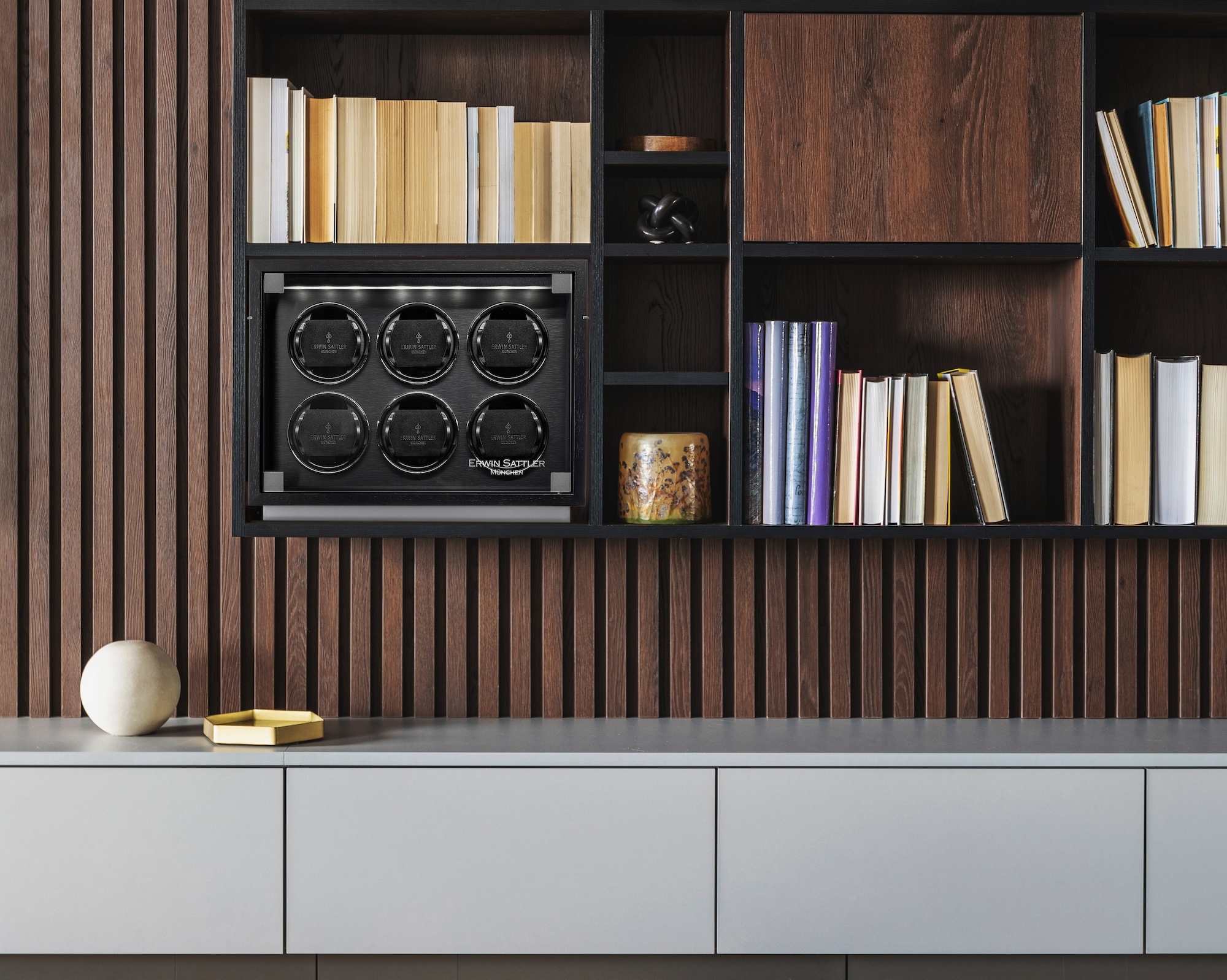 Sechs automatische Armbanduhren finden geschützt hinter einer Glastüre, dekorativ in Szene gesetzt, ihren perfekten Platz. Jeder einzelne Uhrenbeweger kann mit einem beliebigen WLAN-fähigen Endgerät programmiert und gesteuert werden.